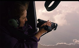 Fig. 4: Jody Gillerman, hanging out of the window of a helicopter, captures video of a volcano for one of her projects. Photo courtesy of Jody Gillerman. (© Jody Gillerman. Photo: Mick Kalber.)