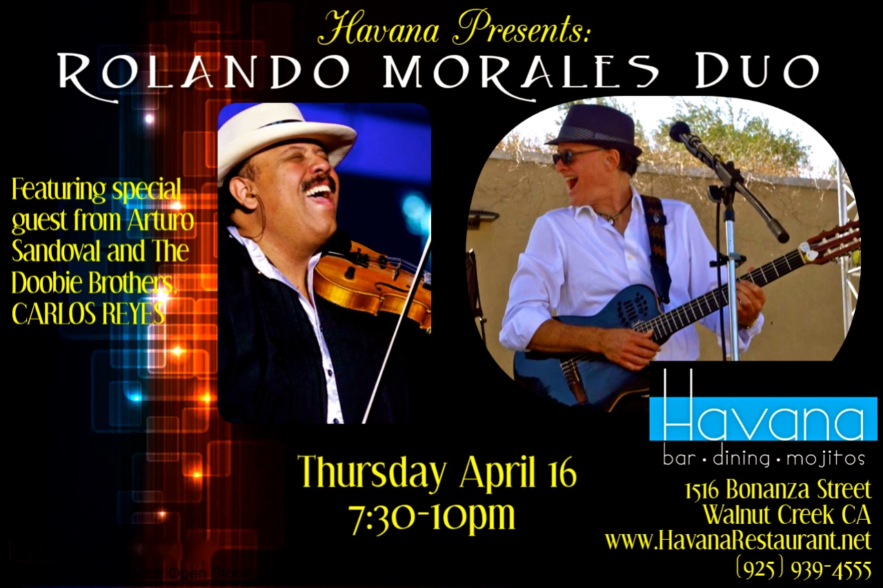 Thursday, April 16, Havana Cuban Cuisine, 1516 Bonanza St., Walnut Creek, 7:30-10:00 pm.  Enjoy a rare appearance of the Rolando Morales Duo at this fine Cuban restaurant, just recently reclaiming its status as a live music venue after the pandemic.  The duet will feature the amazing Paraguayan harpist-violinist-bassist Carlos Reyes, who has played with Arturo Sandoval and the Doobie Brothers, and on guitar and voice, the passionate Rolando Morales.  Together they make a huge sound!  Reserve early at www.havanarestaurant.net,   (925) 939-4555.